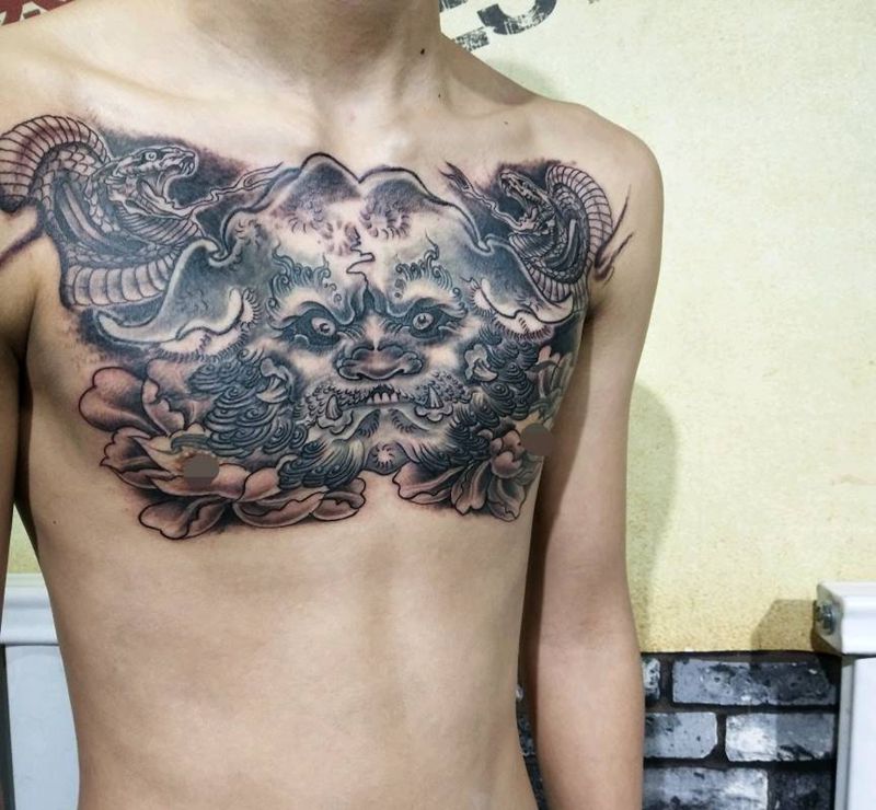 当前位置: 首页 >山东省潍坊市纹身店-忠義堂刺青纹身图案>唐狮花胸纹身图片_胸部纹身图案