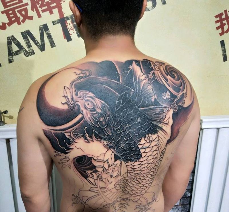满背鲤鱼遮盖后纹身图片_背部纹身图案