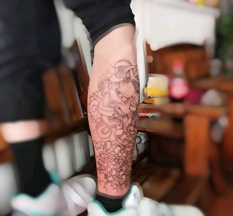当前位置: 首页 >山东省潍坊市纹身店-忠義堂刺青纹身图案>班诺菊花线条纹身图片_腿部纹身图案
