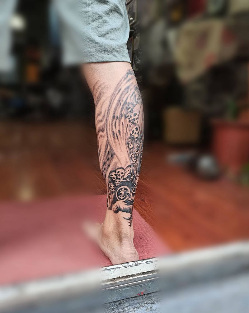 • T网红王老大花腿龙纹身图片_腿部新传统纹身图案