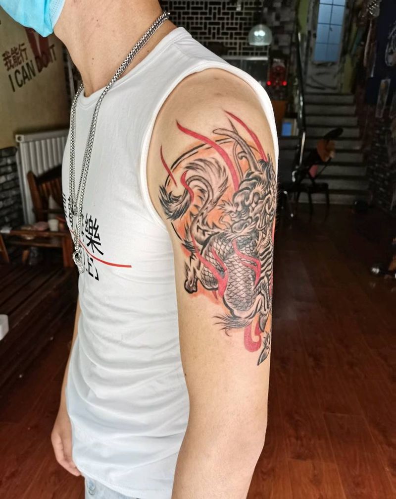 • T网红王老大花腿龙纹身图片_腿部新传统纹身图案