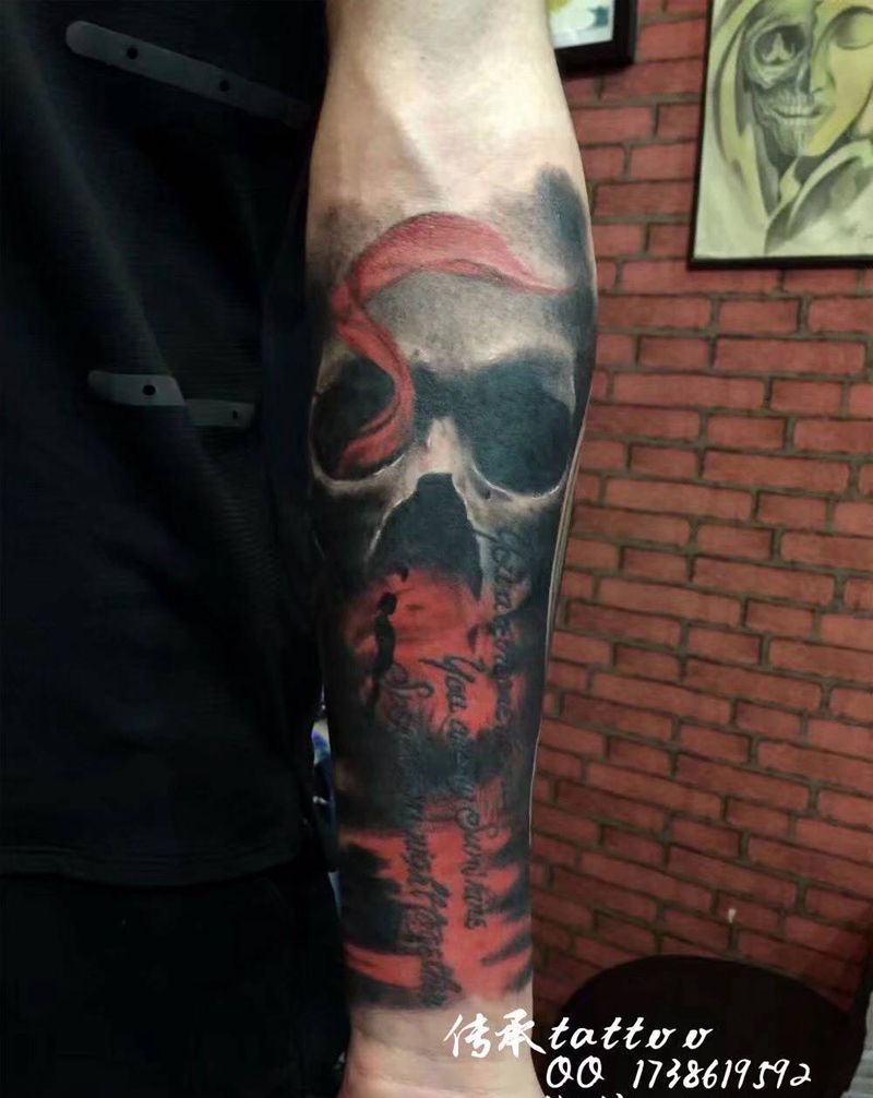 当前位置: 首页 >山东省烟台市纹身店- 传承TATTOO刺青工作室纹身图案>骷髅融合一下字体纹身图片