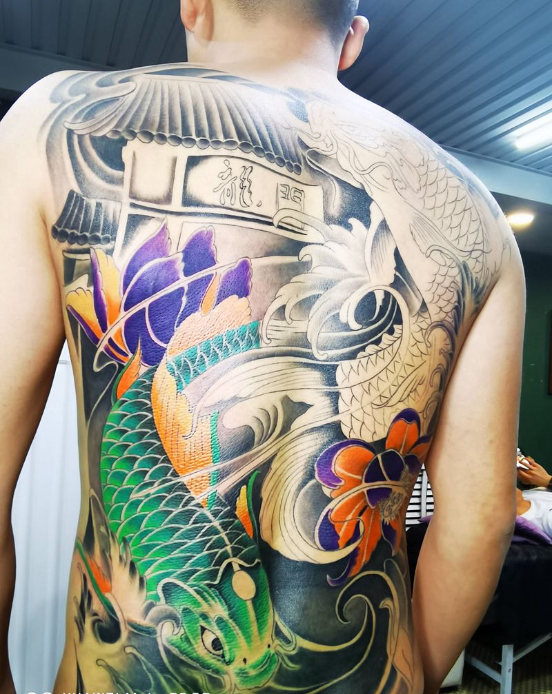 鲤鱼跃龙门。纹身图片_背部新传统纹身图案