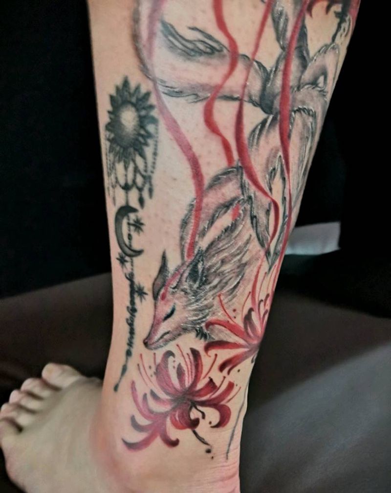 【彼岸花与九尾狐】纹身图片_腿部水墨水彩纹身图案