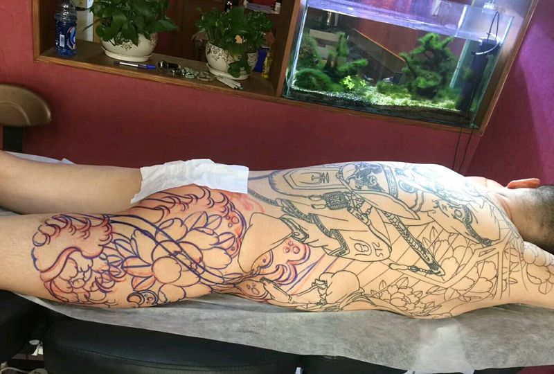 当前位置: 首页 >山东省烟台市纹身店-雷公堂刺青纹身图案>通体进行史纹身图片_胸部背部老传统纹身图案