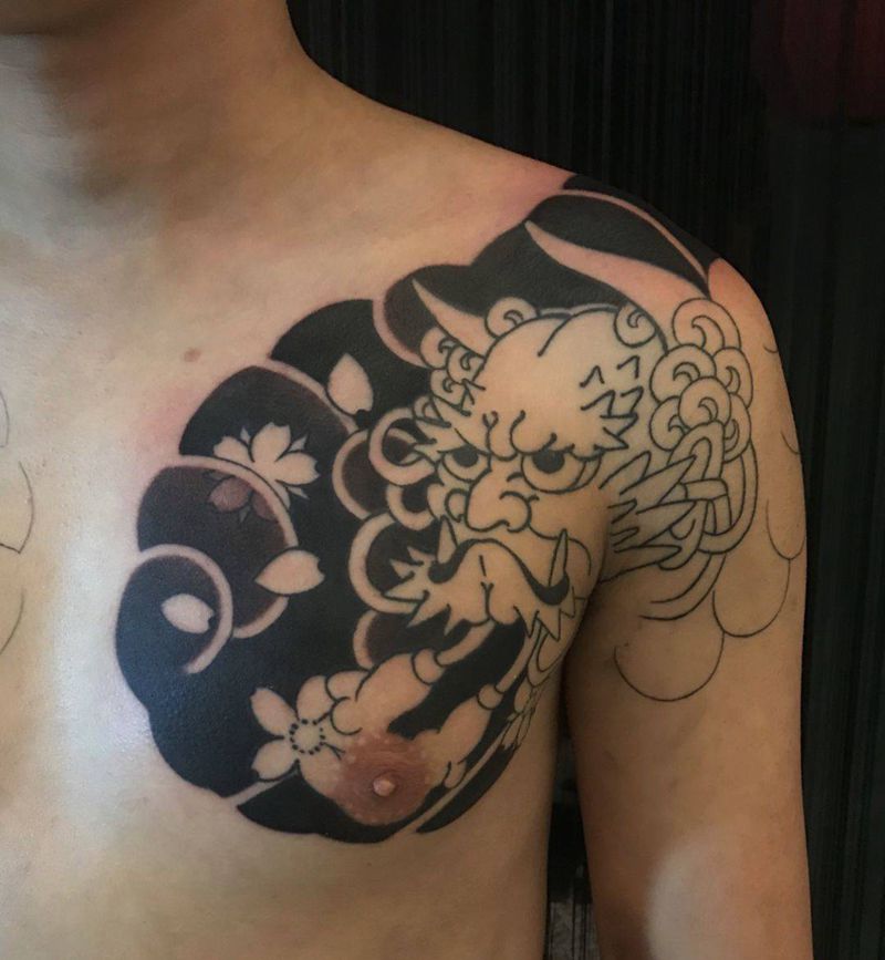 当前位置: 首页 >山东省潍坊市纹身店-针舞刺青TATTOO学员培训纹身图案>老传统半甲纹身图片_胸部纹身图案