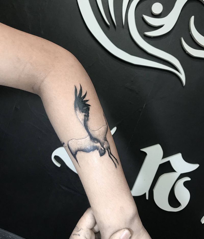 当前位置: 首页 >山东省潍坊市纹身店-针舞刺青TATTOO学员培训纹身图案>仙鹤纹身图片_手臂水墨纹身图案