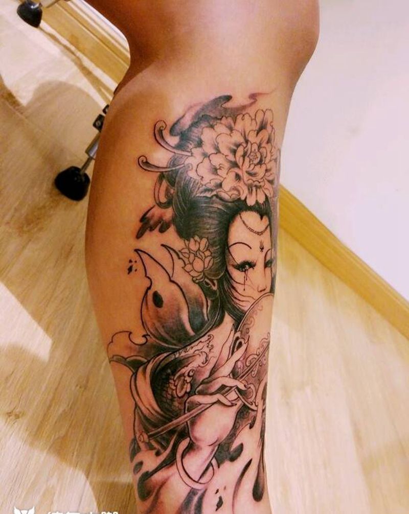 当前位置: 首页 >山东省潍坊市纹身店-青刺青工作室纹身图案>艺妓纹身图片_腿部传统人物纹身图案