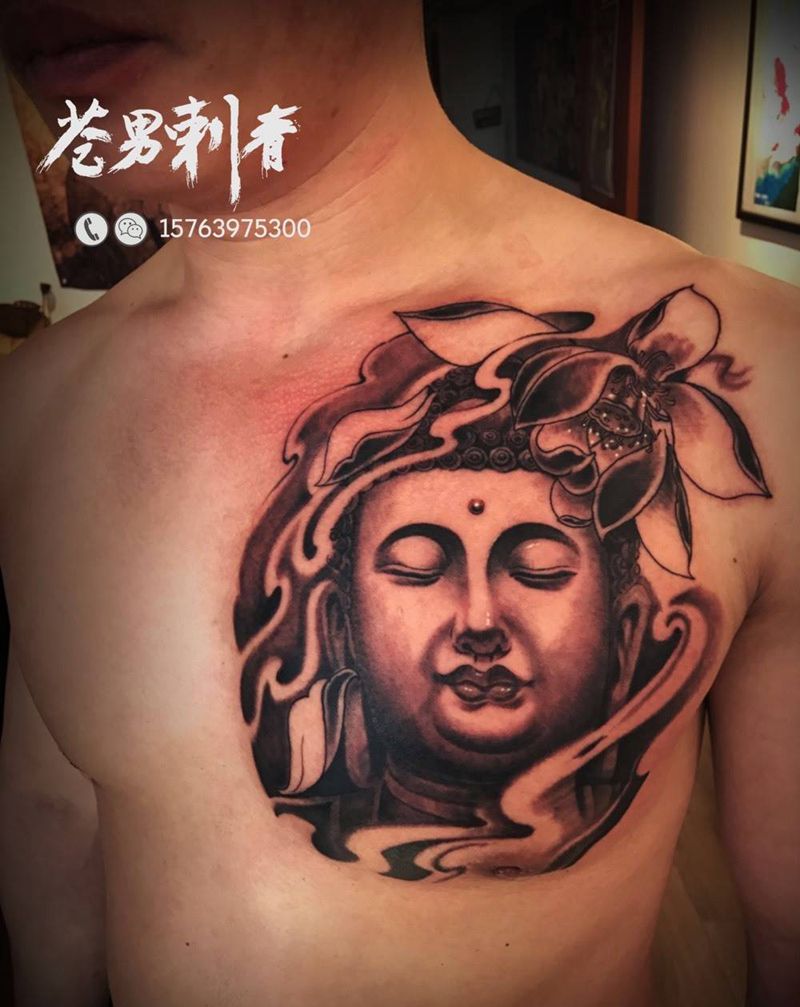 当前位置: 首页 >山东省潍坊市纹身店-青刺青工作室纹身图案>佛首纹身图片_成品胸部传统人物宗教纹身图案