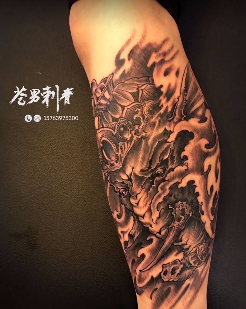 当前位置: 首页 >山东省潍坊市纹身店-青刺青工作室纹身图案>象神纹身图片_成品腿部纹身图案