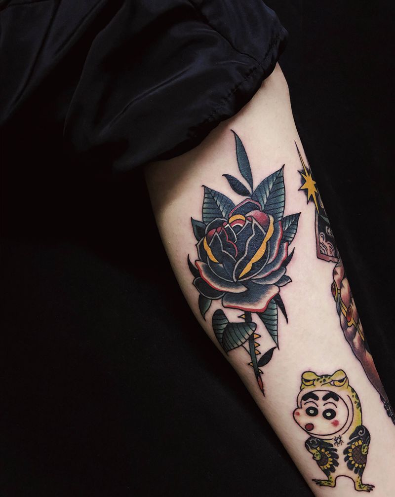 当前位置: 首页 >山东省潍坊市纹身店-青刺青工作室纹身图案>拼接纹身图片_腿部Old School纹身图案