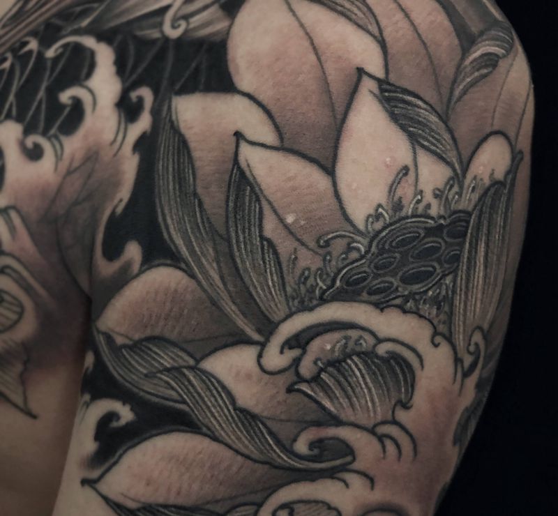 当前位置: 首页 >山东省潍坊市纹身店-青刺青工作室纹身图案>鲤鱼小半胛纹身图片_手臂胸部新传统纹身图案