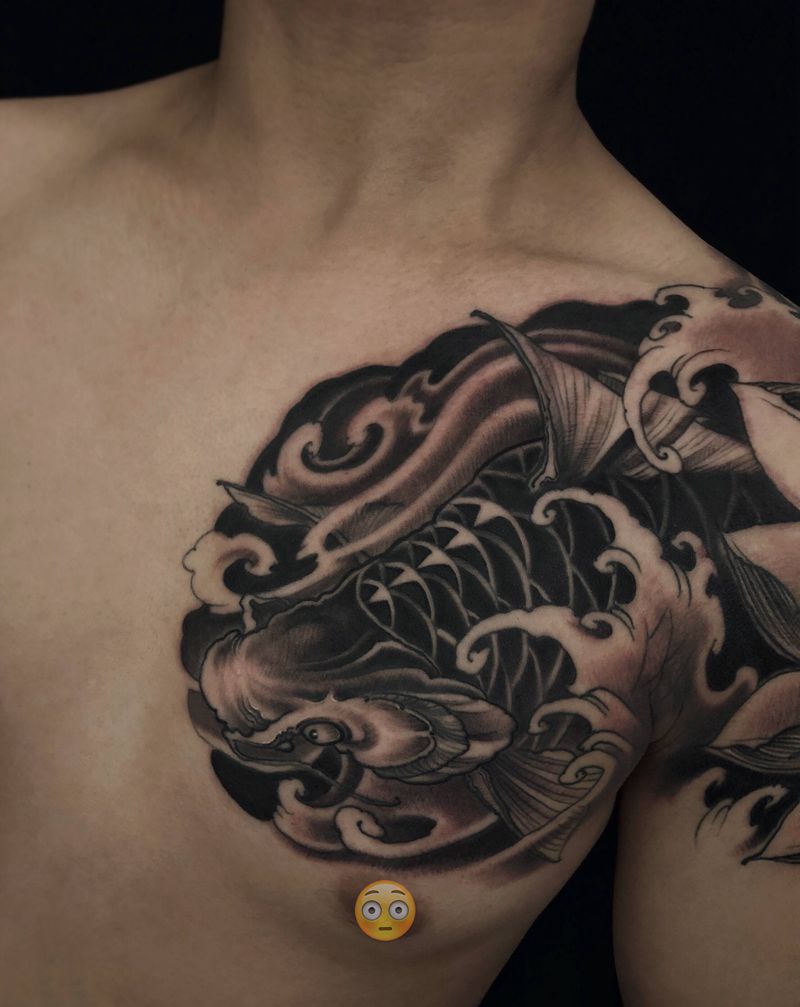 当前位置: 首页 >山东省潍坊市纹身店-青刺青工作室纹身图案>鲤鱼小半胛纹身图片_手臂胸部新传统纹身图案
