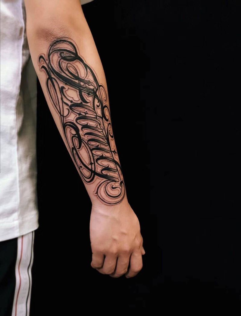 当前位置: 首页 >山东省潍坊市纹身店-青刺青工作室纹身图案>字纹身图片_手臂花体字纹身图案