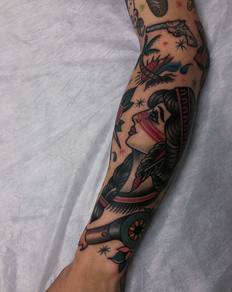当前位置: 首页 >山东省潍坊市纹身店-青刺青工作室纹身图案>花臂修改纹身图片_手臂Old SchoolNew School纹身图案