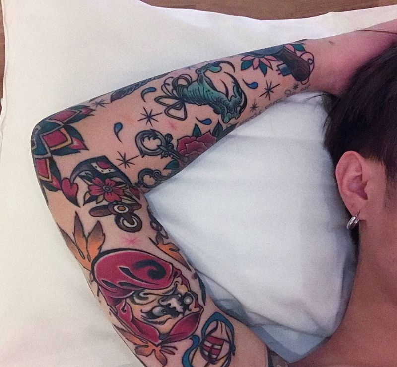 当前位置: 首页 >山东省潍坊市纹身店-青刺青工作室纹身图案>花臂修改纹身图片_手臂Old SchoolNew School纹身图案