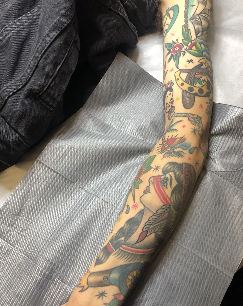 当前位置: 首页 >山东省潍坊市纹身店-青刺青工作室纹身图案>花臂修改纹身图片_手臂Old SchoolNew School纹身图案