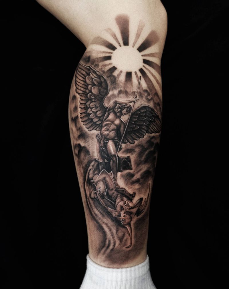 天使恶魔纹身图片_腿部欧美写实纹身图案