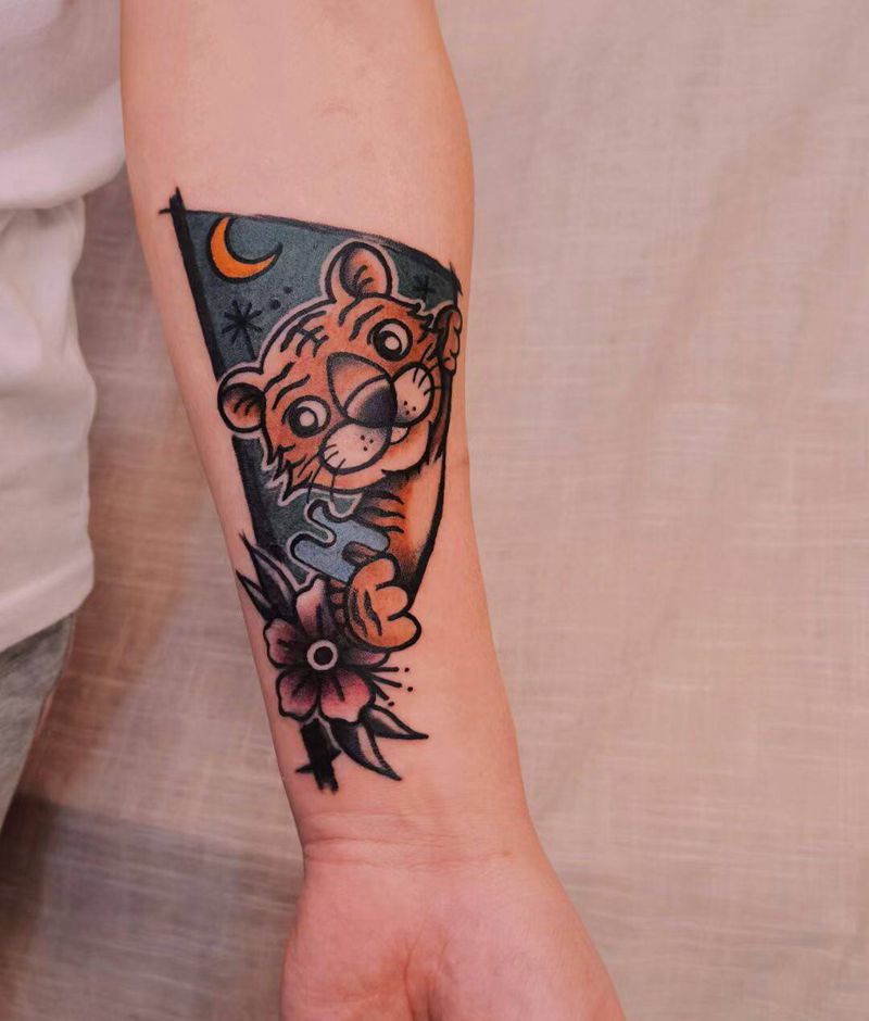 当前位置: 首页 >山东省潍坊市纹身店-青刺青工作室纹身图案>小脑斧纹身图片_手臂Old School纹身图案