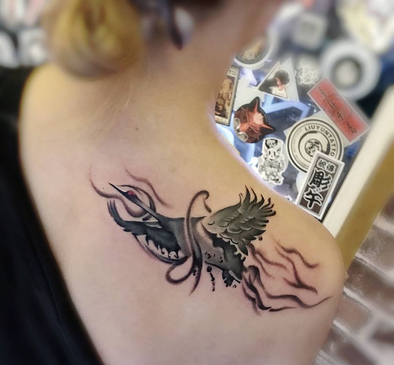 当前位置: 首页 >山东省潍坊市纹身店-茗博刺青纹身图案>仙鹤纹身图片_背部腰部水墨纹身图案