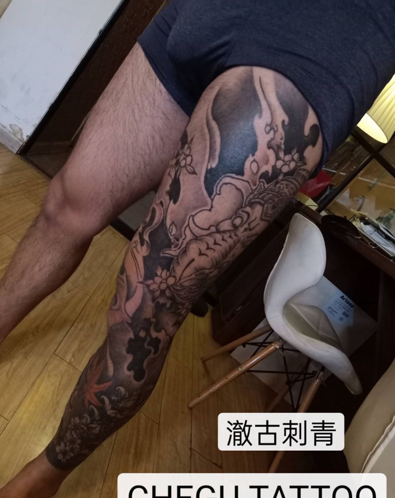 • T网红王老大花腿龙纹身图片_腿部新传统纹身图案