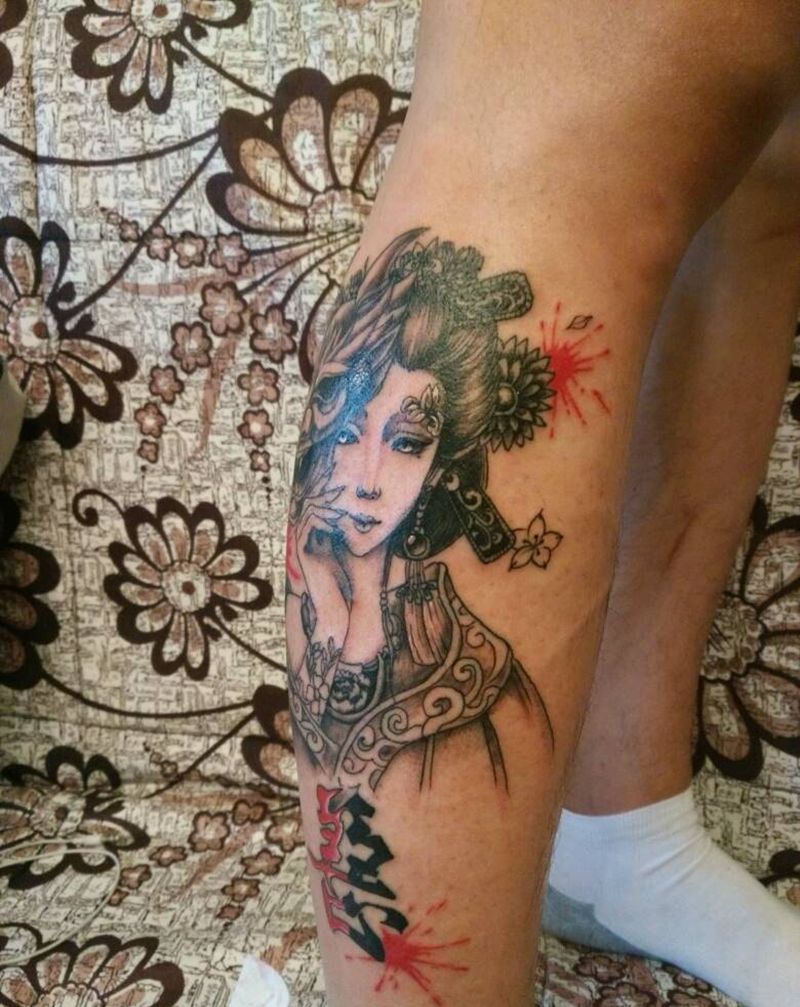 当前位置: 首页 >山东省潍坊市纹身店-澈古刺青纹身图案>小腿艺妓纹身图片
