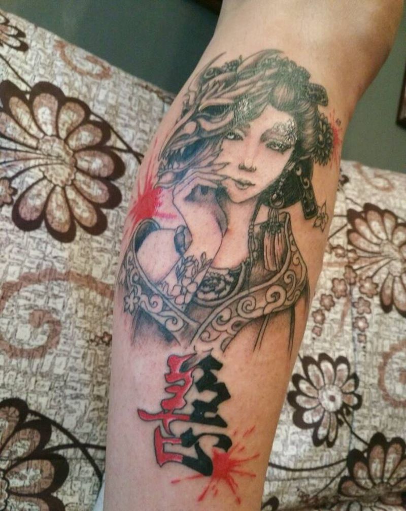当前位置: 首页 >山东省潍坊市纹身店-澈古刺青纹身图案>小腿艺妓纹身图片