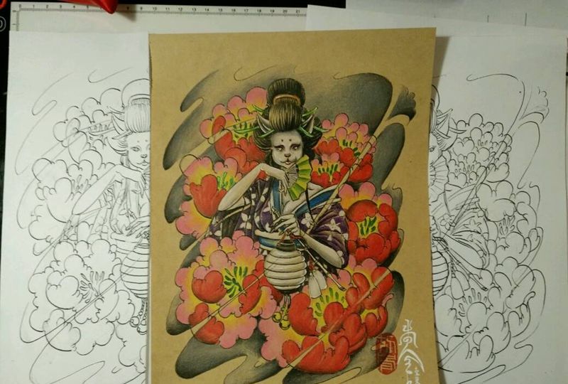 猫艺妓(原创手稿)纹身图片