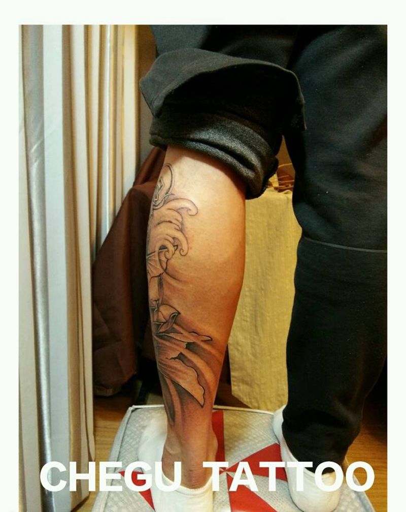 • T网红王老大花腿龙纹身图片_腿部新传统纹身图案