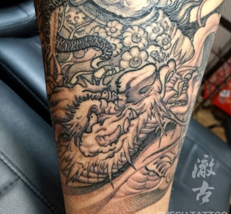 • T网红王老大花腿龙纹身图片_腿部新传统纹身图案