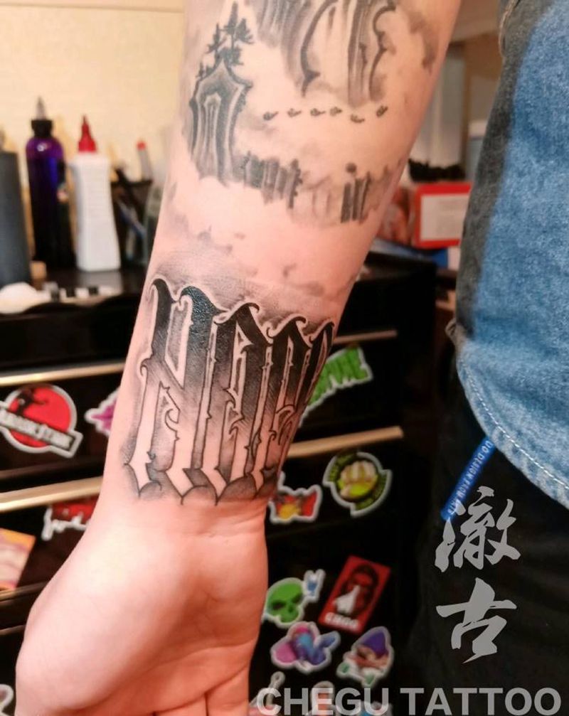当前位置: 首页 >山东省潍坊市纹身店-澈古刺青纹身图案>希望纹身图片_手臂花体字纹身图案