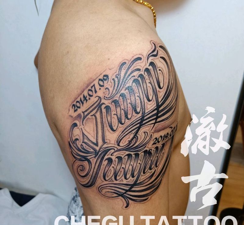 当前位置: 首页 >山东省潍坊市纹身店-澈古刺青纹身图案>花体英文纹身图片_手臂花体字原创纹身图案