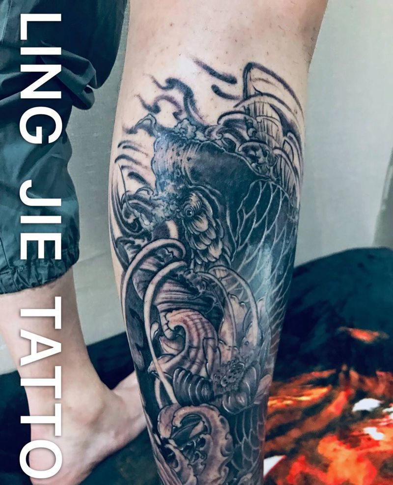 • T网红王老大花腿龙纹身图片_腿部新传统纹身图案