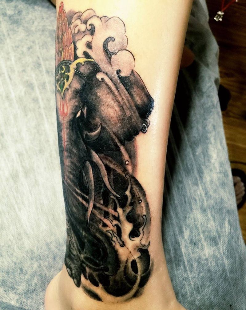 • T网红王老大花腿龙纹身图片_腿部新传统纹身图案