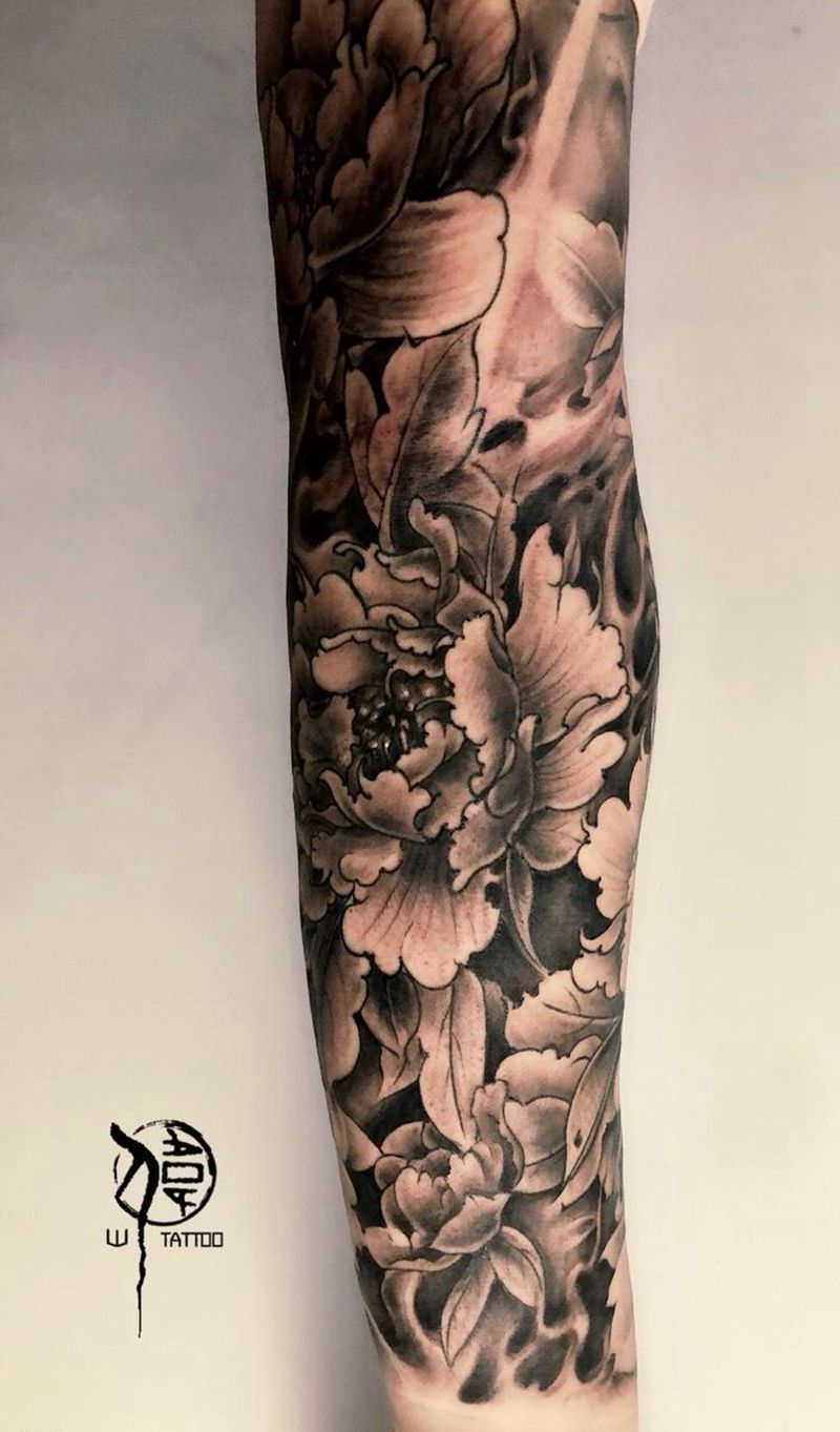 当前位置: 首页 >山东省潍坊市纹身店-山东伟刺青纹身图案>牡丹纹身图片_手臂手稿传统写实植物纹身图案