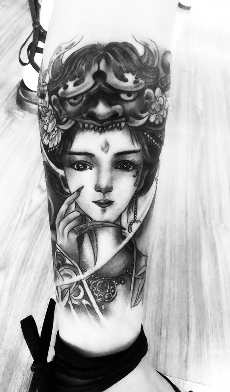 当前位置: 首页 >山东省潍坊市纹身店-山东伟刺青纹身图案>小腿艺妓纹身图片