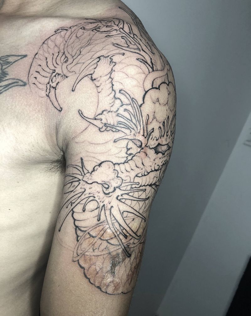当前位置: 首页 >山东省潍坊市纹身店-山东伟刺青纹身图案>遮盖龙纹身图片_肩部手臂新传统纹身图案