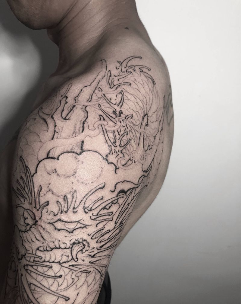 当前位置: 首页 >山东省潍坊市纹身店-山东伟刺青纹身图案>遮盖龙纹身图片_肩部手臂新传统纹身图案