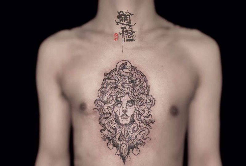 当前位置: 首页 >山东省潍坊市纹身店-随隐刺青纹身图案>美杜莎纹身图片_胸部纹身图案
