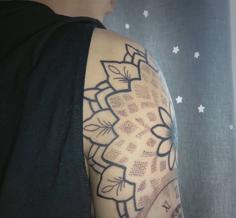 花臂未完待续纹身图片_手臂点刺曼陀罗 钟表纹身图案