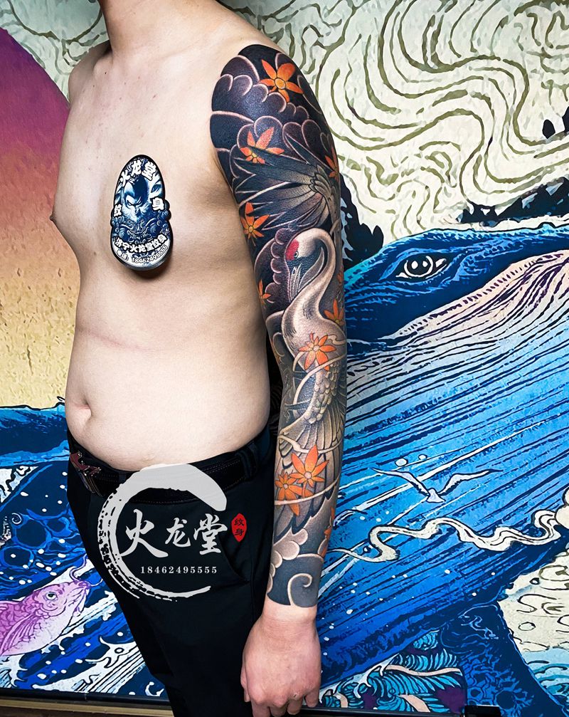 当前位置: 首页 >山东省济宁市纹身店-火龙堂纹身纹身图案>老传统花臂鹤纹身图片_手臂肩部老传统鹤纹身图案