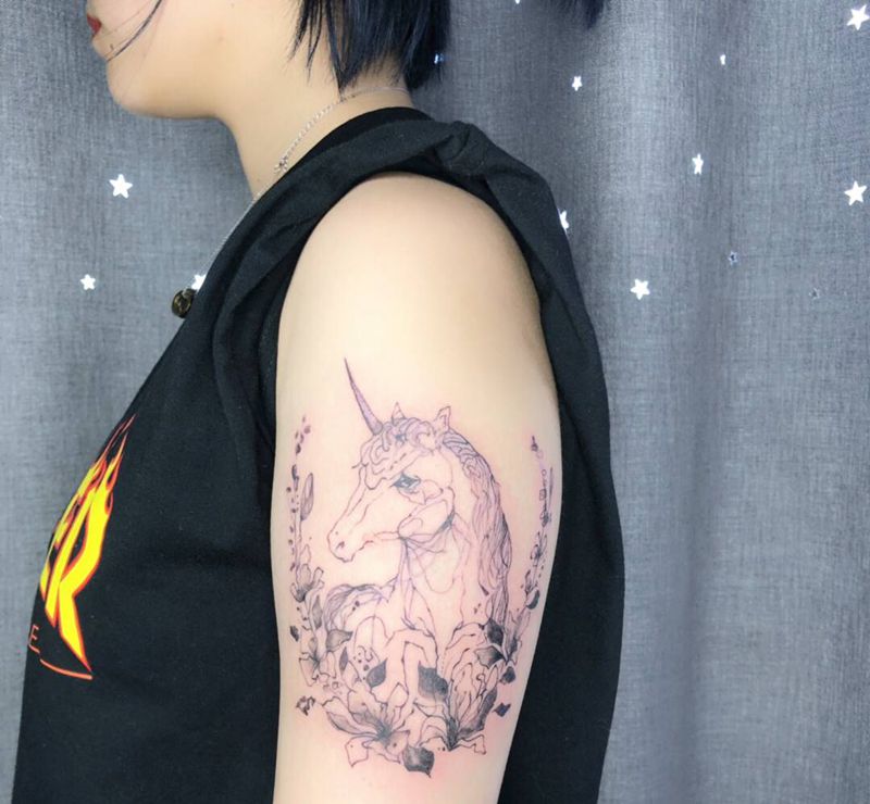 当前位置: 首页 >山东省潍坊市纹身店-随隐刺青纹身图案>独角兽纹身图片_手臂纹身图案