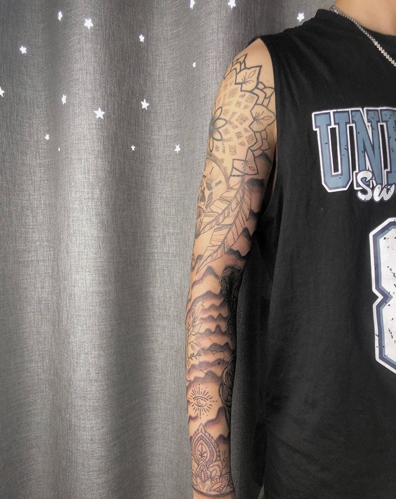 当前位置: 首页 >山东省潍坊市纹身店-随隐刺青纹身图案>花臂纹身图片_手臂花体字点刺纹身图案