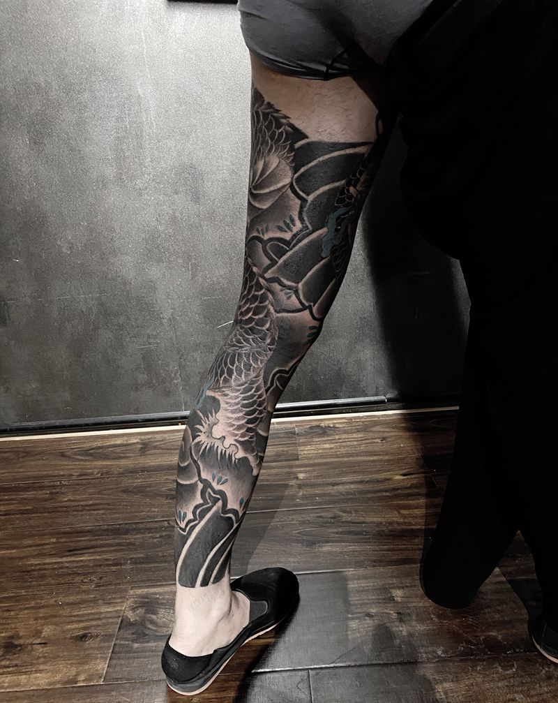 • T网红王老大花腿龙纹身图片_腿部新传统纹身图案