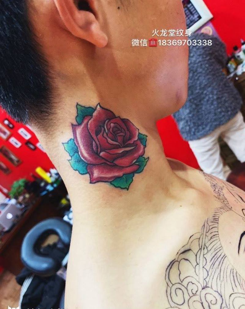 当前位置: 首页 >山东省济宁市纹身店-火龙堂纹身纹身图案>脖子部位玫瑰花纹身图片
