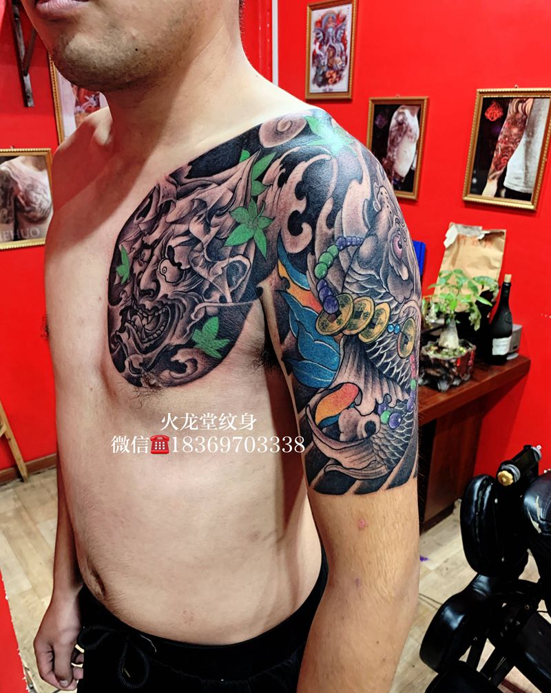 半甲鱼和般若纹身图片_手臂胸部老传统新传统纹身图案