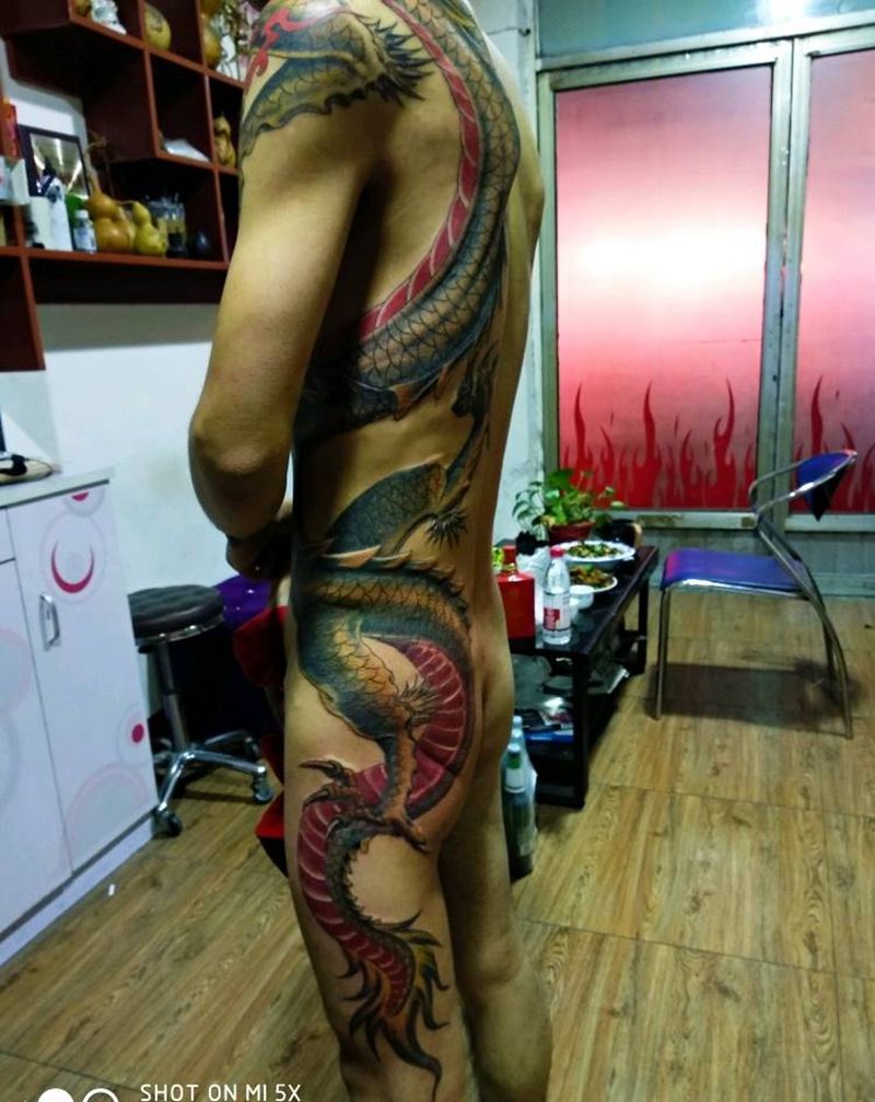 • T网红王老大花腿龙纹身图片_腿部新传统纹身图案