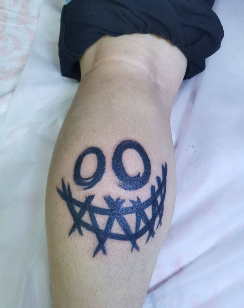 当前位置: 首页 >山东省潍坊市纹身店-刺青部落纹身图案>笑脸纹身图片_腿部水墨纹身图案