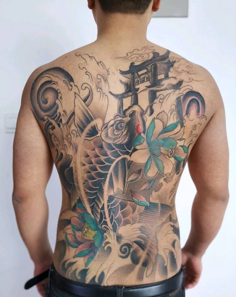 鲤鱼跃龙门纹身图片_背部新传统纹身图案