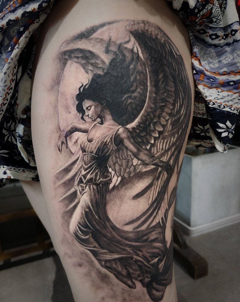 大天使纹身图片_腿部欧美写实纹身图案